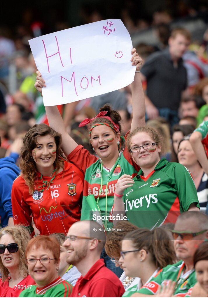 25 August 2013; Mayo supporters Nuala Connolly, centre, from Kilmaine, and her friends Laura Muldoon, from Mulranny, and Hanna Callaghan, from Achil, send good wishes to their mother's in the Davin stand of Croke Park. GAA Football All-Ireland Senior Championship Semi-Final, Mayo v Tyrone, Croke Park, Dublin. Picture credit: Ray McManus / SPORTSFILE