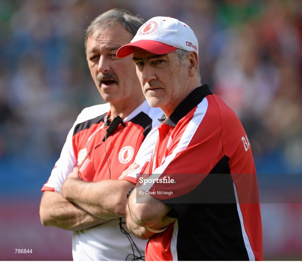 25 August 2013; Tyrone manager Mickey Harte, right, and assistant manager Tony Donnelly. GAA Football All-Ireland Senior Championship Semi-Final, Mayo v Tyrone, Croke Park, Dublin. Picture credit: Oliver McVeigh / SPORTSFILE