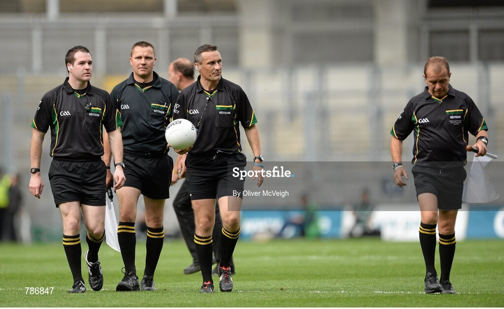 25 August 2013; The match officials, from left to right, Martin McNally, sideline official, Rory Hickey, linesman, Maurice Deegan, rReferee and Eddie Kinsella, standby referee, leave the field at half time. GAA Football All-Ireland Senior Championship Semi-Final, Mayo v Tyrone, Croke Park, Dublin. Picture credit: Oliver McVeigh / SPORTSFILE