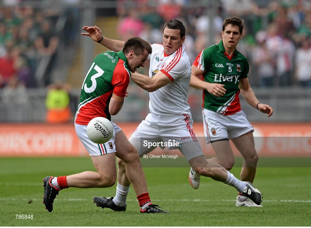 25 August 2013; Cillian O'Connor, Mayo, reacts after colliding with Conor Gormley, Tyrone. GAA Football All-Ireland Senior Championship Semi-Final, Mayo v Tyrone, Croke Park, Dublin. Picture credit: Oliver McVeigh / SPORTSFILE