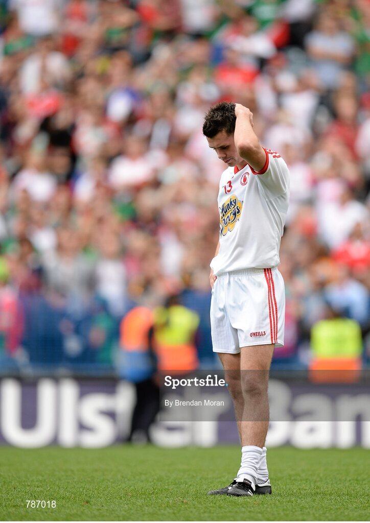 25 August 2013; A dejected Darren McCurry, Tyrone, after the final whistle. GAA Football All-Ireland Senior Championship Semi-Final, Mayo v Tyrone, Croke Park, Dublin. Picture credit: Brendan Moran / SPORTSFILE