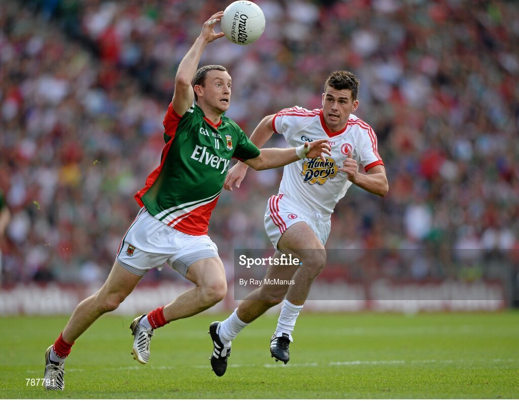 25 August 2013; Keith Higgins, Mayo, in action against Darren McCurry, Tyrone. GAA Football All-Ireland Senior Championship Semi-Final, Mayo v Tyrone, Croke Park, Dublin. Picture credit: Ray McManus / SPORTSFILE