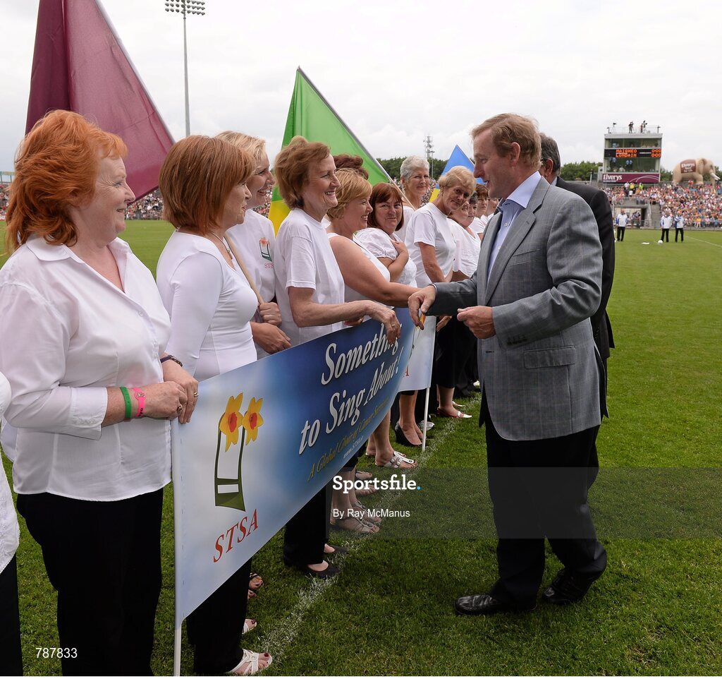 21 July 2013; An Taoiseach Enda Kenny T.D. meets singers from the 'Something to Sing About' group. Connacht GAA Football Senior Championship Final, Mayo v London, Elverys MacHale Park, Castlebar, Co. Mayo. Picture credit: Ray McManus / SPORTSFILE