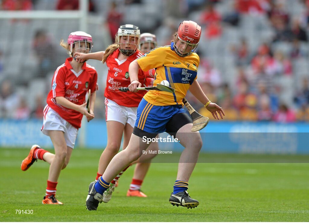 8 September 2013; Meadbh Scally, from Scoil Mhuire CBS, Mullingar, Co. Westmeath, representing Clare, in action against Katie Condon, from Upperchurch N.S. Thurles, Co. Tipperary, representing Cork. INTO/RESPECT Exhibition GoGames during the GAA Hurling All-Ireland Senior Championship Final between Cork and Clare, Croke Park, Dublin. Picture credit: Matt Browne / SPORTSFILE