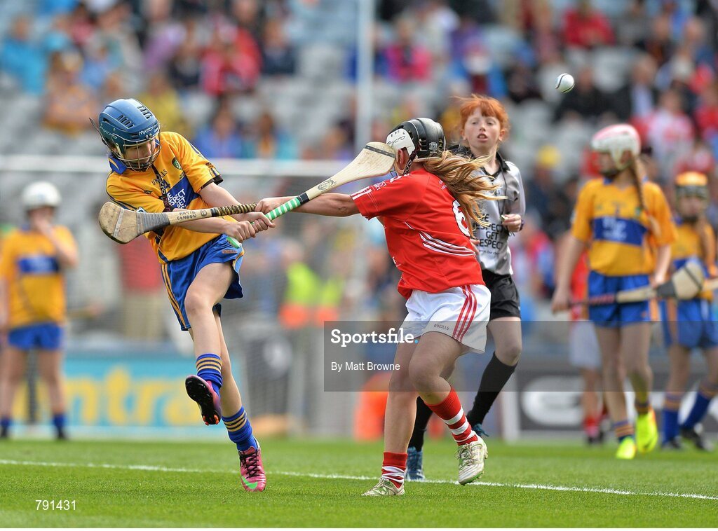 8 September 2013; Lorna Foley, from Bunscoil Bhóthar na Naoimh, Lismore, Co. Waterford, representing Clare, in action against Katie Condon, from Upperchurch N.S. Thurles, Co. Tipperary, representing Cork. INTO/RESPECT Exhibition GoGames during the GAA Hurling All-Ireland Senior Championship Final between Cork and Clare, Croke Park, Dublin. Picture credit: Matt Browne / SPORTSFILE