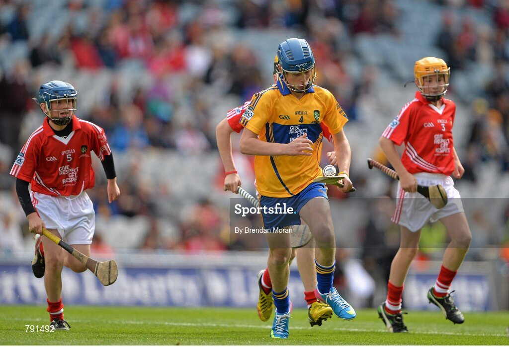 8 September 2013; Nathan Earner, from St. Brendan's N.S. Eyrecourt, Ballinasloe, Co. Galway, representing Clare, in action against Conall Byrne, from Hollywood N.S. Hollywood, Co. Wicklow, representing Cork. INTO/RESPECT Exhibition GoGames during the GAA Hurling All-Ireland Senior Championship Final between Cork and Clare, Croke Park, Dublin. Picture credit: Brendan Moran / SPORTSFILE