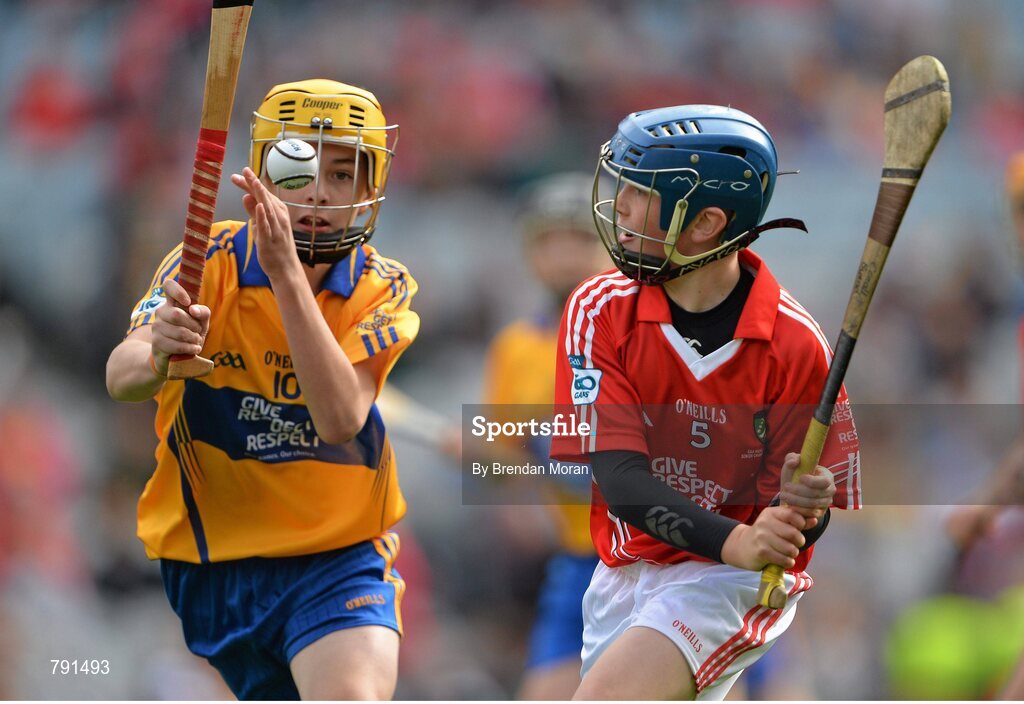 8 September 2013; Conall Byrne, from Hollywood N.S. Hollywood, Co. Wicklow, representing Cork, in action against Danny O'Leary, from Scoul Dean Cussen, Bruff, Co. Limerick, representing Clare. INTO/RESPECT Exhibition GoGames during the GAA Hurling All-Ireland Senior Championship Final between Cork and Clare, Croke Park, Dublin. Picture credit: Brendan Moran / SPORTSFILE