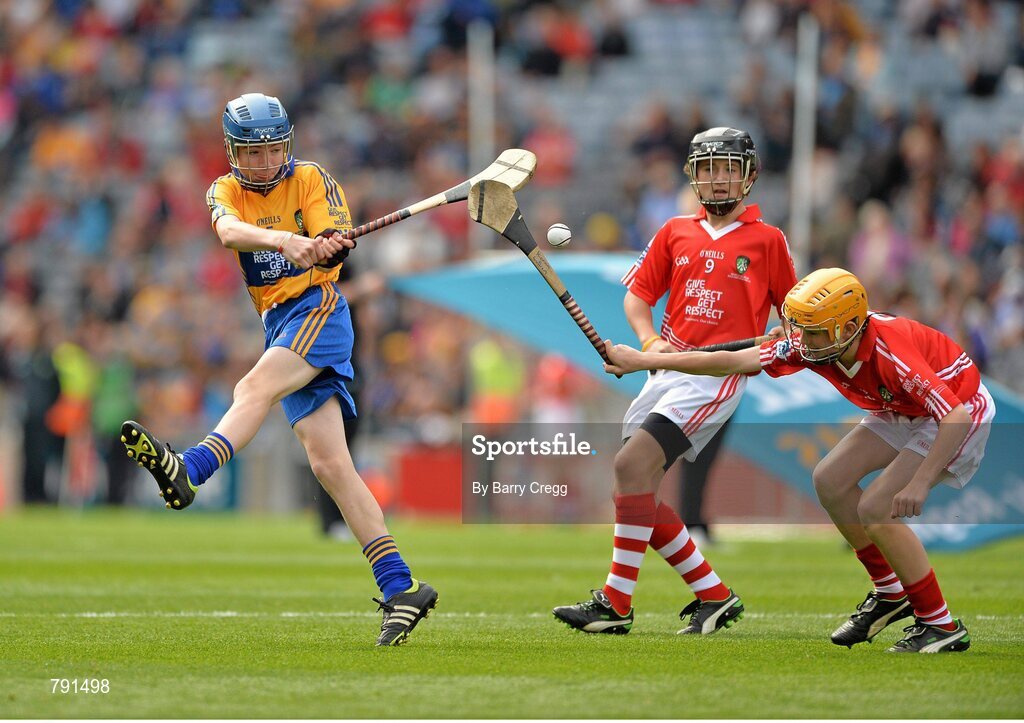 8 September 2013; Ciaran Doherty, from St. Brigids N.S. Tooreen, Co. Mayo, representing Clare, in action against Kieran O'Sullivan, from Shandrum N.S. Newtownshandrum, Co. Cork, representing Cork. INTO/RESPECT Exhibition GoGames during the GAA Hurling All-Ireland Senior Championship Final between Cork and Clare, Croke Park, Dublin. Picture credit: Barry Cregg / SPORTSFILE