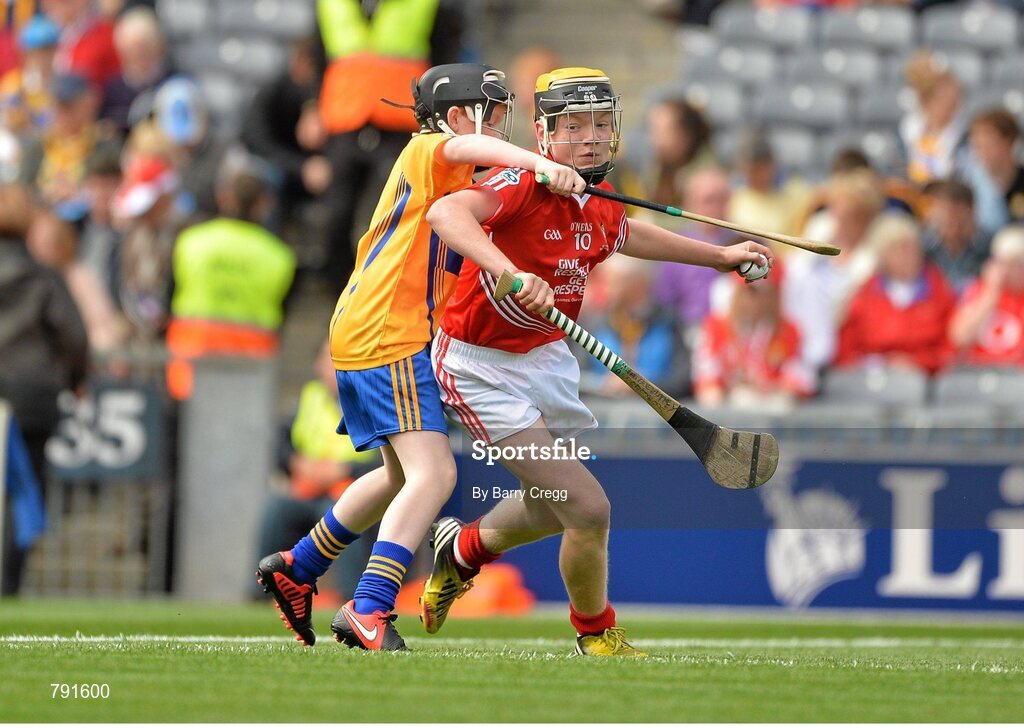 8 September 2013; Liam Delaney, from Castown P.S. Portlaoise, Co. Laois, representing Cork, in action against Seán Murnane, from St. Teresa's N.S. Kilflynn, Co. Kerry, representing Clare. INTO/RESPECT Exhibition GoGames during the GAA Hurling All-Ireland Senior Championship Final between Cork and Clare, Croke Park, Dublin. Picture credit: Barry Cregg / SPORTSFILE