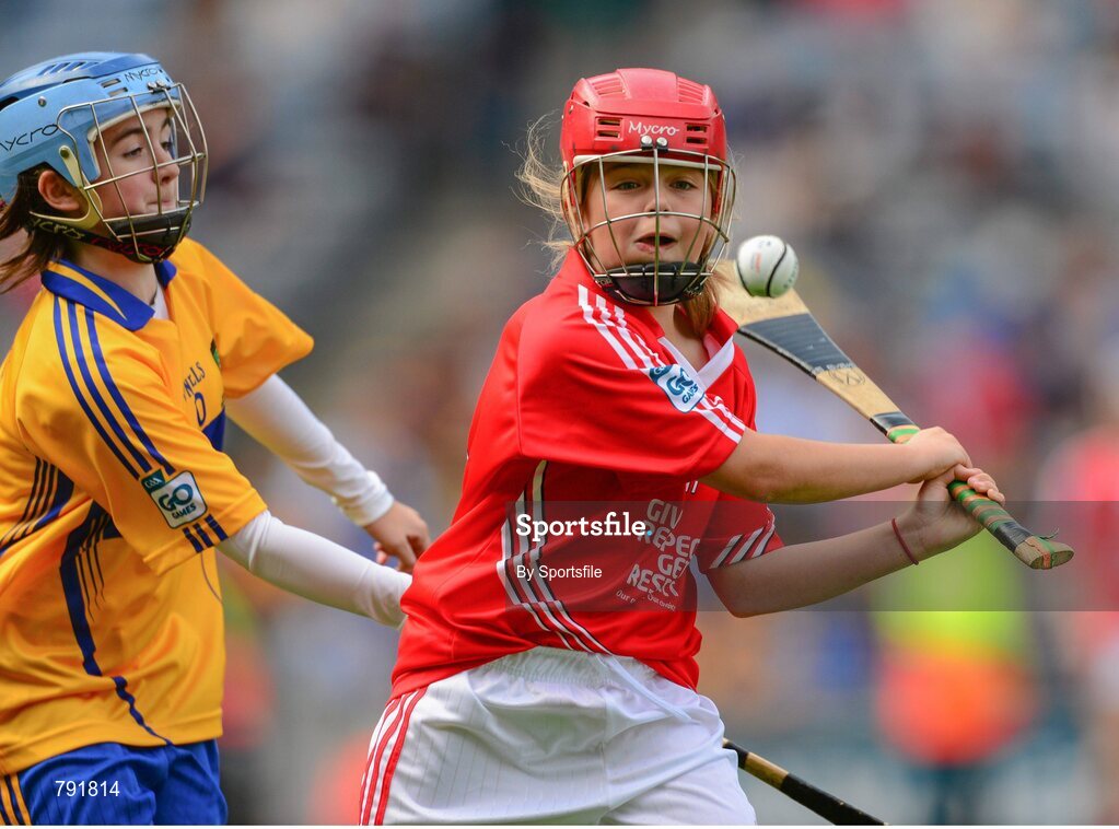 8 September 2013; Louise O'Callaghan, from Flagmount/Dromindoora N.S. Feakle, Co. Clare, representing Cork, in action against Eimear Duffy, from Scoil na gCailíní, Castleblayney, Co. Monaghan, representing Clare. INTO/RESPECT Exhibition GoGames during the GAA Hurling All-Ireland Senior Championship Final between Cork and Clare, Croke Park, Dublin. Photo by Sportsfile