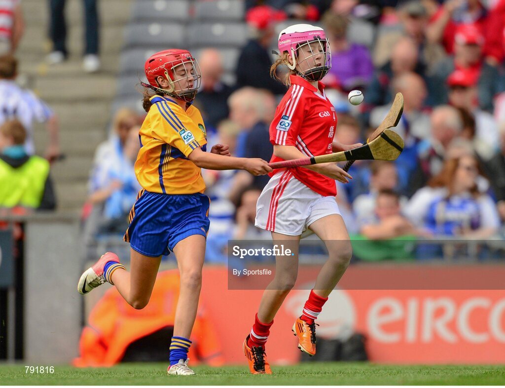 8 September 2013; Sara Kelly, from Kildalkey N.S. Kildalkey, Co. Meath, representing Cork, in action against Louise O'Callaghan, from Gaelscoil Uí Néill, Oileán an Ghuail, Co. Tyrone, representing Clare. INTO/RESPECT Exhibition GoGames during the GAA Hurling All-Ireland Senior Championship Final between Cork and Clare, Croke Park, Dublin. Photo by Sportsfile