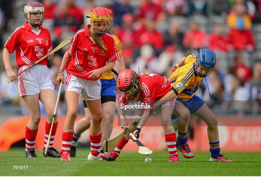 8 September 2013; Ciara Murphy, from St. Olaf's N.S. Dundrum, Co. Dublin, representing Cork, in action against Lorna Foley, from Bunscoil Bhóthar na Naoimh, Lismore, Co. Waterford, representing Clare. INTO/RESPECT Exhibition GoGames during the GAA Hurling All-Ireland Senior Championship Final between Cork and Clare, Croke Park, Dublin. Photo by Sportsfile