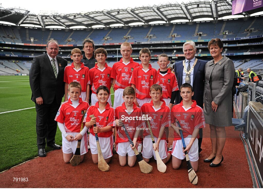 8 September 2013; Uachtarán Chumann Lúthchleas Gael Liam Ó Néill, left, INTO President Breandán Ó Suilleabháin, President of the Camogie Association Aileen Lawlor, with the Cork team, back row, left to right, Shane O'Boyle, Luke O'Connor, Liam Delaney, Kieran O'Sullivan, Conall Byrne, front row, left to right, Eoin Flaherty, Owen McDermott, Cathal Feeney, Paddy McDermott, Jack Murphy. INTO/RESPECT Exhibition GoGames during the GAA Hurling All-Ireland Senior Championship Final between Cork and Clare, Croke Park, Dublin. Picture credit: Dáire Brennan / SPORTSFILE