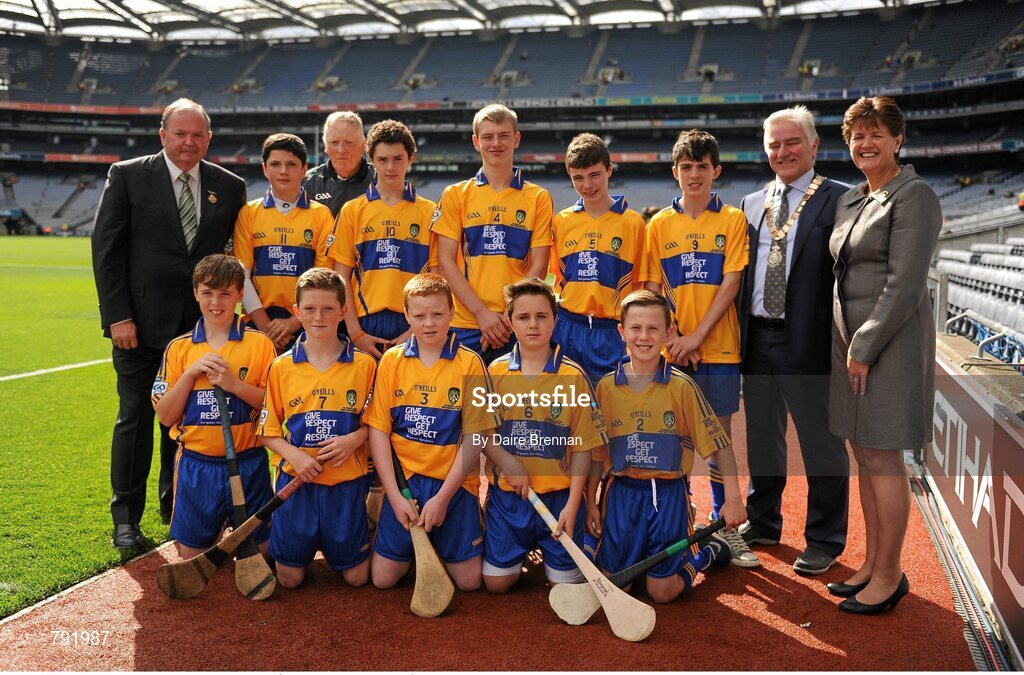 8 September 2013; Uachtarán Chumann Lúthchleas Gael Liam Ó Néill, left, INTO President Breandán Ó Suilleabháin, President of the Camogie Association Aileen Lawlor, with the Clare team, back row, left to right, Luke Mallion, Danny O'Leary, Nathan Earner, Ciarán Doherty, Maitiú O'Donohoe, front row, left to right, Thomas Brennan, Jack Corry, Seán Murnane, James Grogan, Gareth Gifford. INTO/RESPECT Exhibition GoGames during the GAA Hurling All-Ireland Senior Championship Final between Cork and Clare, Croke Park, Dublin. Picture credit: Dáire Brennan / SPORTSFILE