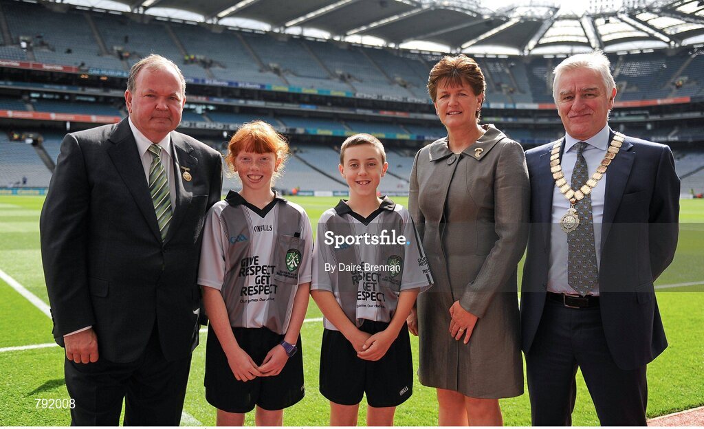 8 September 2013; Uachtarán Chumann Lúthchleas Gael, Liam Ó Néill, left, INTO President, Breandán Ó Suilleabháin, President of the Camogie Association, Aileen Lawlor, with referees Ciarán O'Leary and Lisa O'Keeffe. INTO/RESPECT Exhibition GoGames during the GAA Hurling All-Ireland Senior Championship Final between Cork and Clare, Croke Park, Dublin. Picture credit: Dáire Brennan / SPORTSFILE