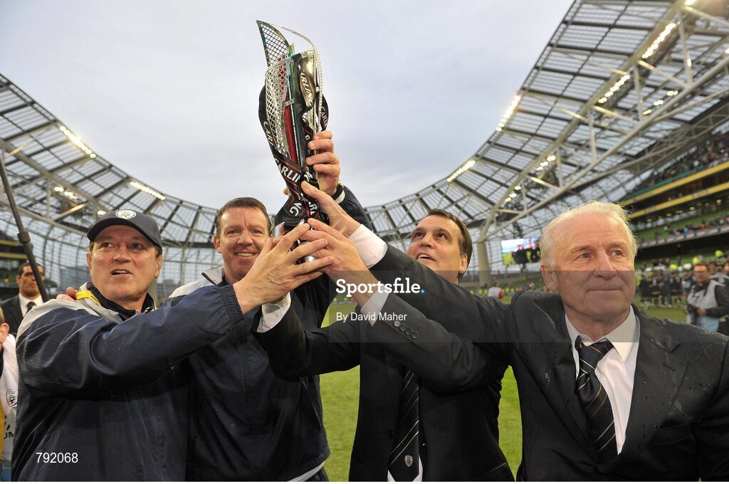 29 May 2011; Fausto Rossi, left, fitness coach, Alan Kelly, goalkeeping coach, Marco Tardelli, assistant manager, and Giovanni Trapattoni, right, manager, celebrate with the Carling Four Nations trophy after the game. Carling Four Nations Tournament, Republic of Ireland v Scotland, Aviva Stadium, Lansdowne Road, Dublin. Picture credit: David Maher / SPORTSFILE