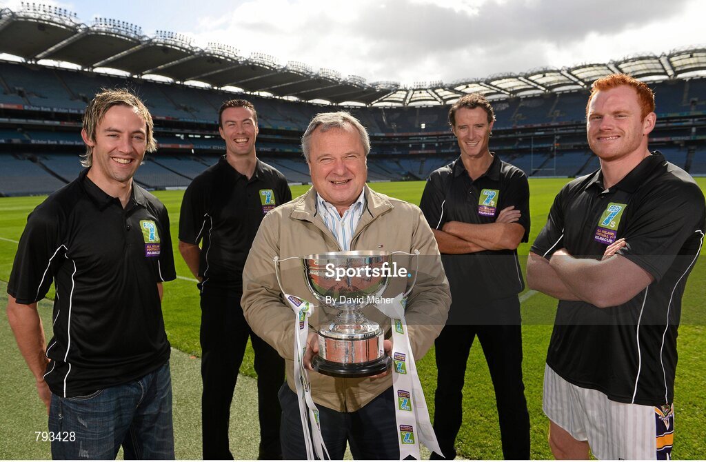 16 September 2013; The groups and teams for the FBD 7s, Ireland’s premier 7s football competition, were announced today in Croke Park. The FBD 7s is taking place in Kilmacud this Saturday, 21st September 2013 and 32 of Ireland’s top club teams will be taking part. At the launch of the 2013 FBD 7s hosted by Kilmacud Crokes were former are former Dublin and Kilmacud Crokes manager Tommy Lyons, centre, with former Mayo and Dublin players, from left, Conor Mortimer, Ray Cosgrove, Kevin O'Neill and Mark Vaughan. FBD All-Ireland Football Sevens Launch, Croke Park, Dublin. Picture credit: David Maher / SPORTSFILE