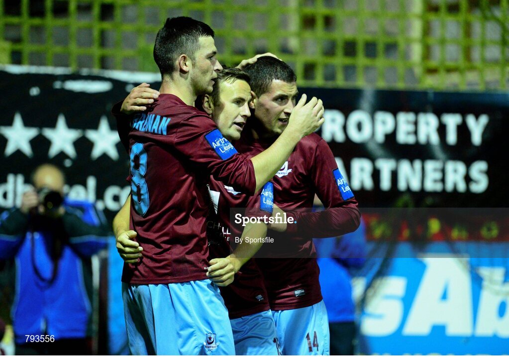 16 September 2013; David Cassidy, Drogheda United, celebrates after scoring his side's second goal with team-mates Ryan Brennan, left, and Graham Rusk, right. FAI Ford Cup Quarter-Final Replay, Drogheda United v Finn Harps, Hunky Dorys Park, Drogheda, Co. Louth. Photo by Sportsfile
