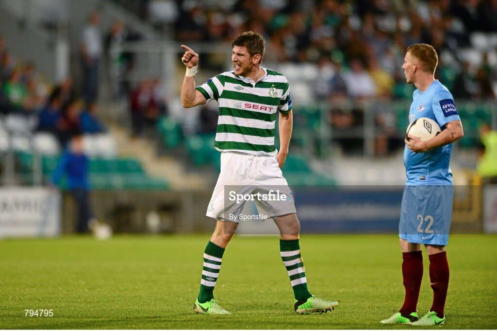 21 September 2013; Ken Oman, Shamrock Rovers, reacts after being sent off by referee Padraigh Sutton. EA Sports Cup Final, Shamrock Rovers v Drogheda United, Tallaght Stadium, Tallaght, Co. Dublin. Photo by Sportsfile