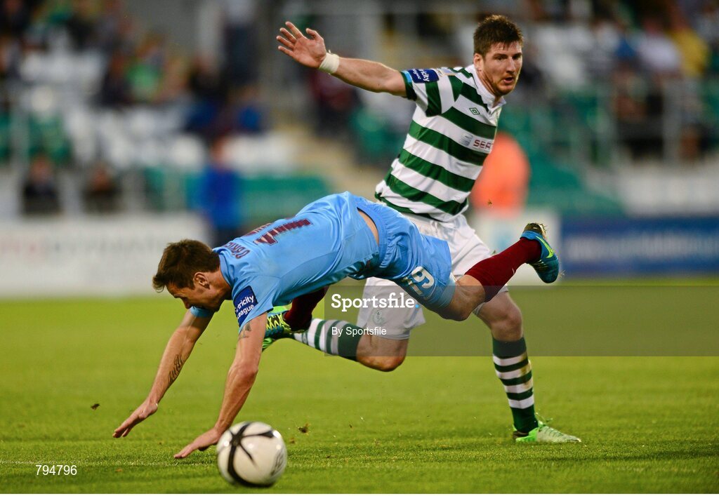 21 September 2013; Declan O'Brien, Drogheda United, is tackled by Ken Oman, Shamrock Rovers, for which Oman was given a second yellow card and sent off by referee Padraigh Sutton. EA Sports Cup Final, Shamrock Rovers v Drogheda United, Tallaght Stadium, Tallaght, Co. Dublin. Photo by Sportsfile