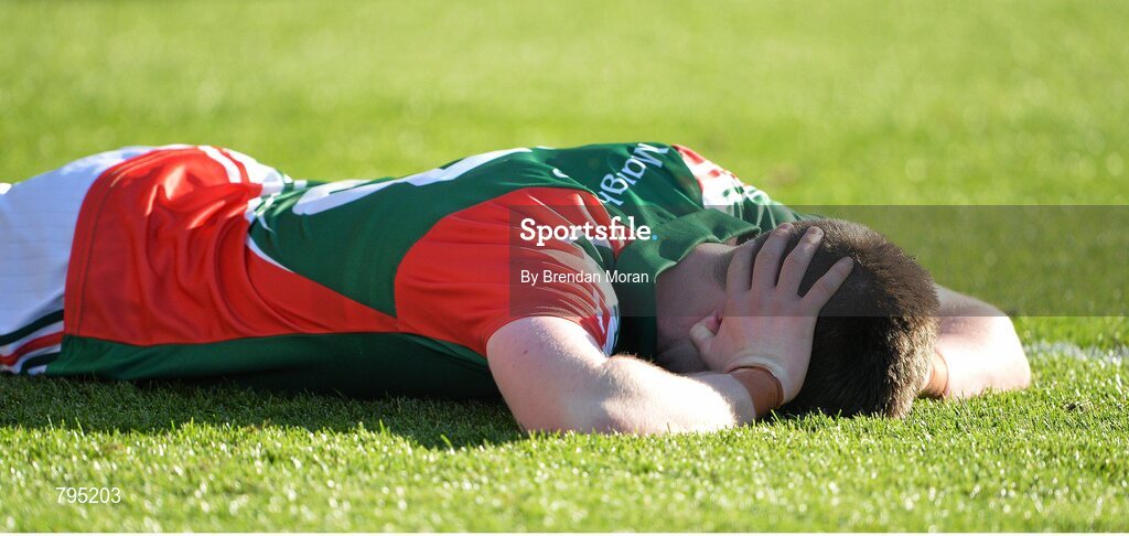 22 September 2013; A dejected Cillian O'Connor, Mayo, following his side's defeat. GAA Football All-Ireland Senior Championship Final, Dublin v Mayo, Croke Park, Dublin. Picture credit: Brendan Moran / SPORTSFILE