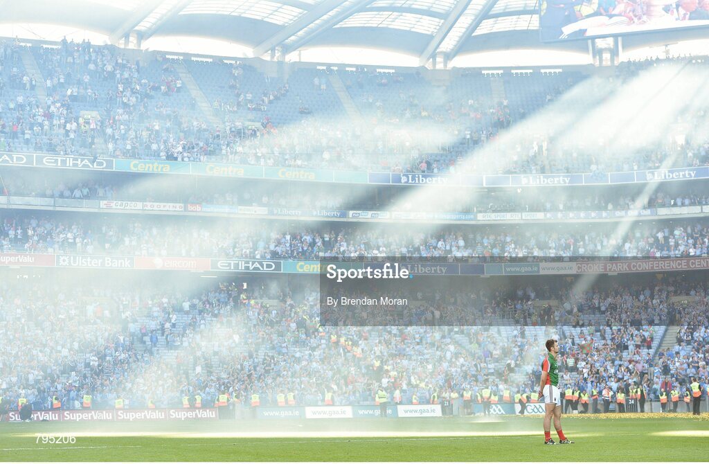 22 September 2013; Jason Gibbons, Mayo, watches the cup presentation amid fog from fireworks after the game. GAA Football All-Ireland Senior Championship Final, Dublin v Mayo, Croke Park, Dublin. Picture credit: Brendan Moran / SPORTSFILE