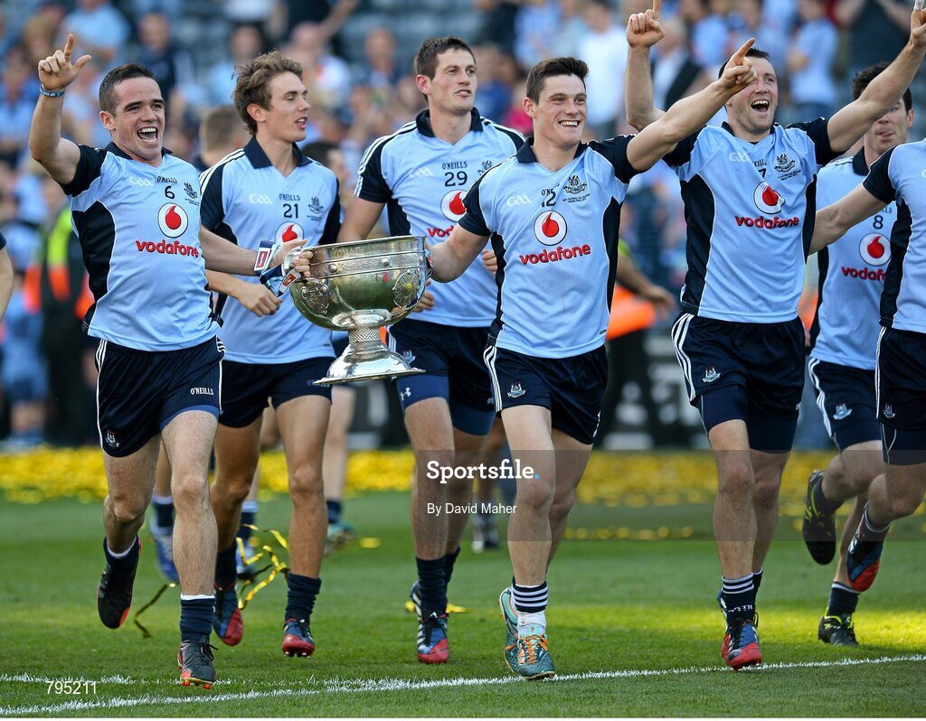 22 September 2013; Ger Brennan, left, and Diarmuid Connolly, Dublin, celebrate with the Sam Maguire cup at the end of the game. GAA Football All-Ireland Senior Championship Final, Dublin v Mayo, Croke Park, Dublin. Picture credit: David Maher / SPORTSFILE
