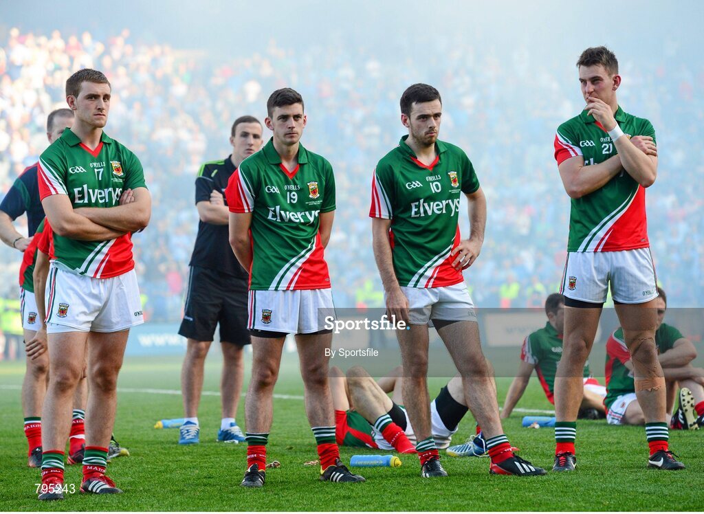 22 September 2013; Dejected Mayo players, from left, Shane McHale, Brendan Harrison, Kevin McLoughlin, and Barry Moran, after the game. GAA Football All-Ireland Senior Championship Final, Dublin v Mayo, Croke Park, Dublin. Photo by Sportsfile