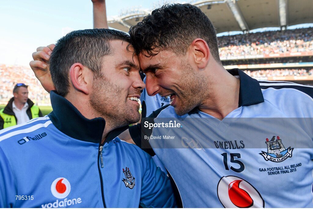22 September 2013; Bernard Brogan, Dublin, celebrates with Bernard Dunne, a member of the Dublin backroom staff and former WBA Super Bantamweight World Champion, at the end of the game. GAA Football All-Ireland Senior Championship Final, Dublin v Mayo, Croke Park, Dublin. Picture credit: David Maher / SPORTSFILE
