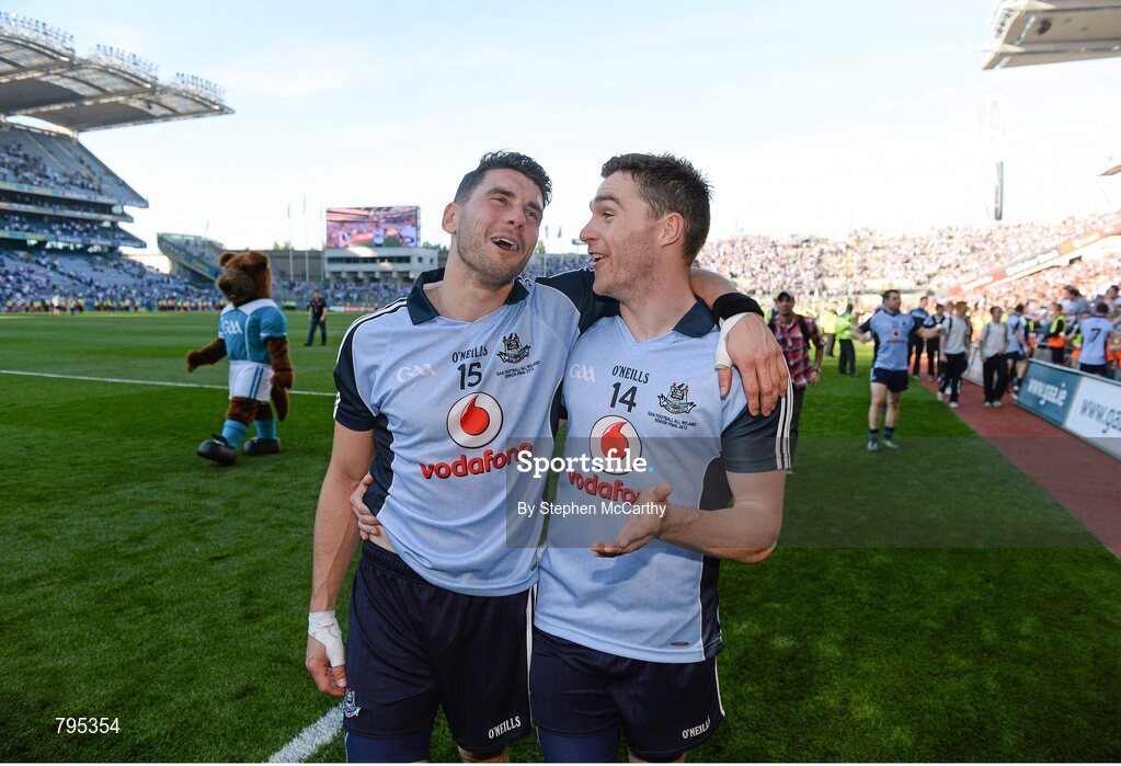 22 September 2013; Dublin's Bernard Brogan, left, and Paddy Andrews following their side's victory. GAA Football All-Ireland Senior Championship Final, Dublin v Mayo, Croke Park, Dublin. Picture credit: Stephen McCarthy / SPORTSFILE