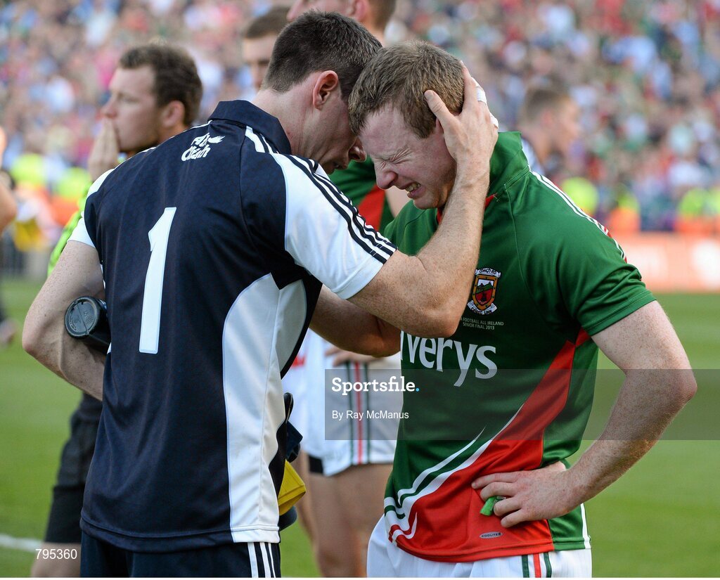 22 September 2013; Dublin captain Stephen Cluxton tries to console Colm Boyle of Mayo after the game. GAA Football All-Ireland Senior Championship Final, Dublin v Mayo, Croke Park, Dublin. Picture credit: Ray McManus / SPORTSFILE