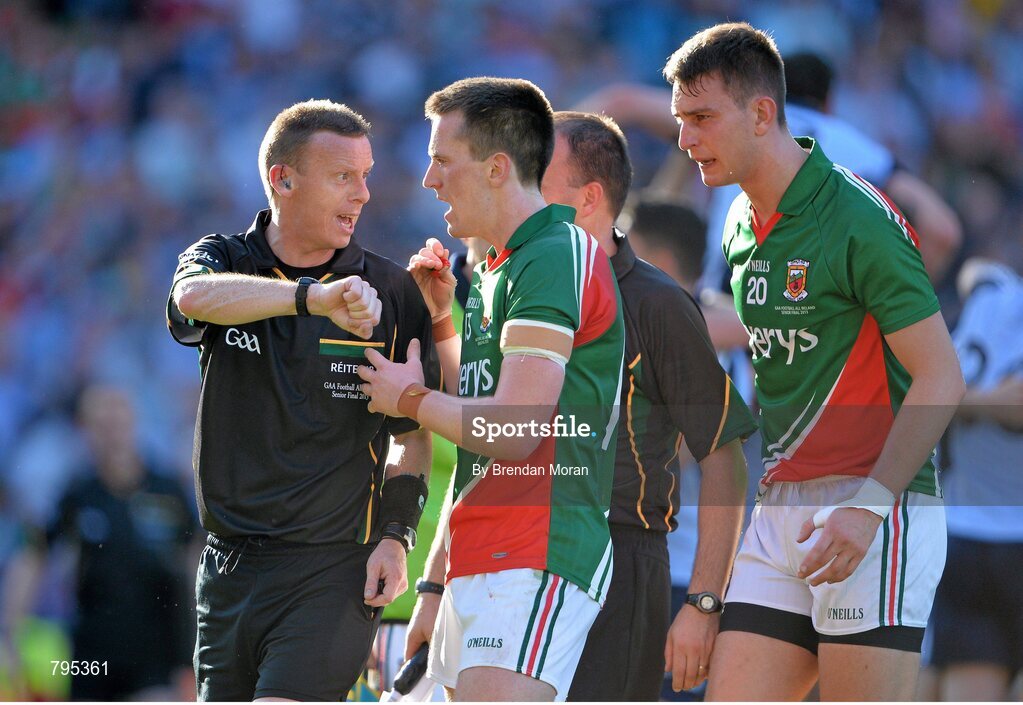 22 September 2013; Mayo's Cillian O'Connor and Barry Moran, right, confront referee Joe McQuillan after the final whistle. GAA Football All-Ireland Senior Championship Final, Dublin v Mayo, Croke Park, Dublin. Picture credit: Brendan Moran / SPORTSFILE