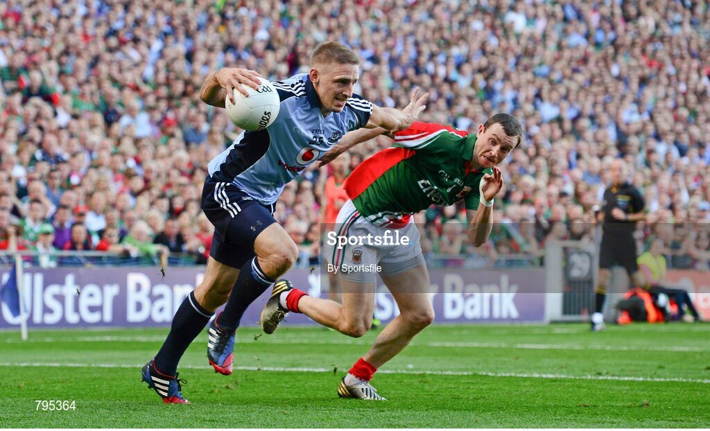 22 September 2013; Eoghan O'Gara, Dublin, in action against Keith Higgins, Mayo. GAA Football All-Ireland Senior Championship Final, Dublin v Mayo, Croke Park, Dublin. Photo by Sportsfile