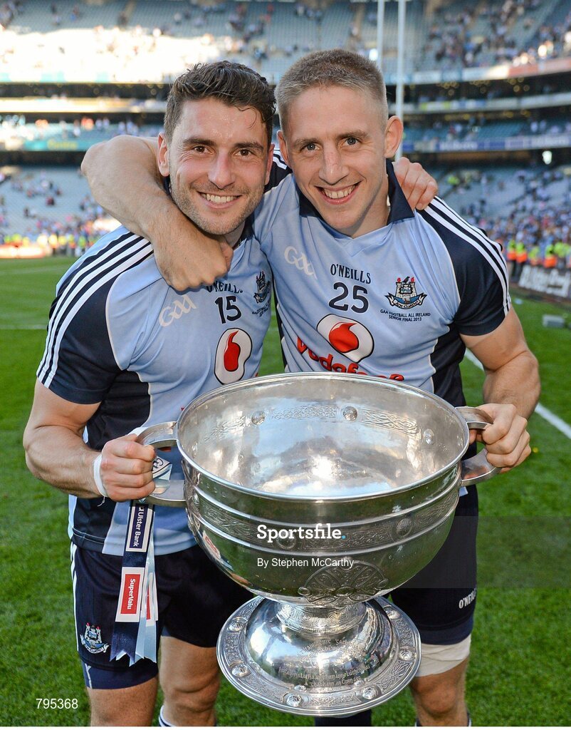 22 September 2013; Dublin players Bernard Brogan, left, and Eoghan O'Gara celebrate with the Sam Maguire Cup following their side's victory. GAA Football All-Ireland Senior Championship Final, Dublin v Mayo, Croke Park, Dublin. Picture credit: Stephen McCarthy / SPORTSFILE