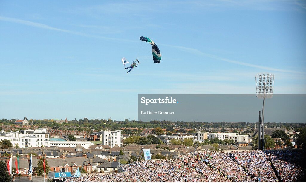22 September 2013; A member of the Irish Parachute Club arrives in to Croke Park with the match ball ahead of the GAA Football All-Ireland Senior Championship Final, Dublin v Mayo, Croke Park, Dublin. Picture credit: Dáire Brennan / SPORTSFILE