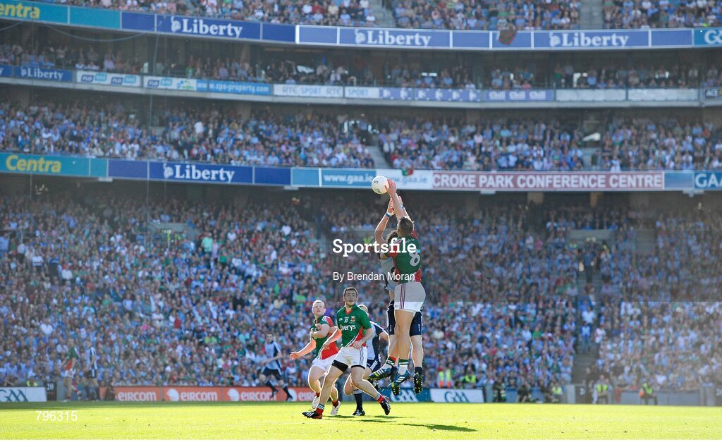 22 September 2013; Michael Darragh MacAuley, Dublin, and Aidan O'Shea, Mayo, contest a kick out. GAA Football All-Ireland Senior Championship Final, Dublin v Mayo, Croke Park, Dublin. Picture credit: Brendan Moran / SPORTSFILE