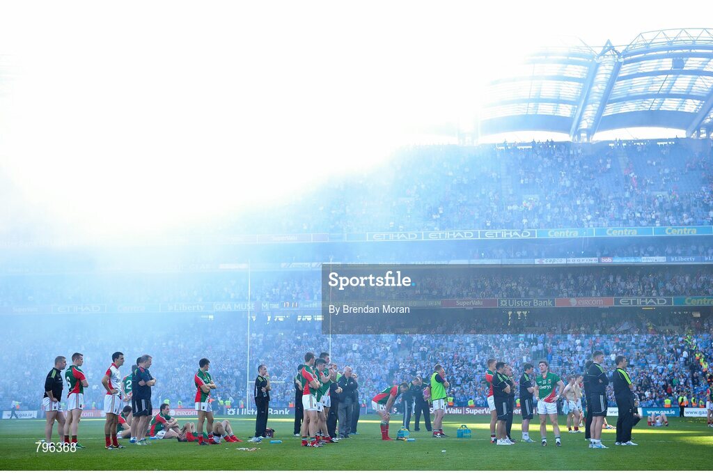 22 September 2013; The Mayo team look on during the presentation of the Sam Maguire cup amid heavy smoke from after match fireworks. GAA Football All-Ireland Senior Championship Final, Dublin v Mayo, Croke Park, Dublin. Picture credit: Brendan Moran / SPORTSFILE
