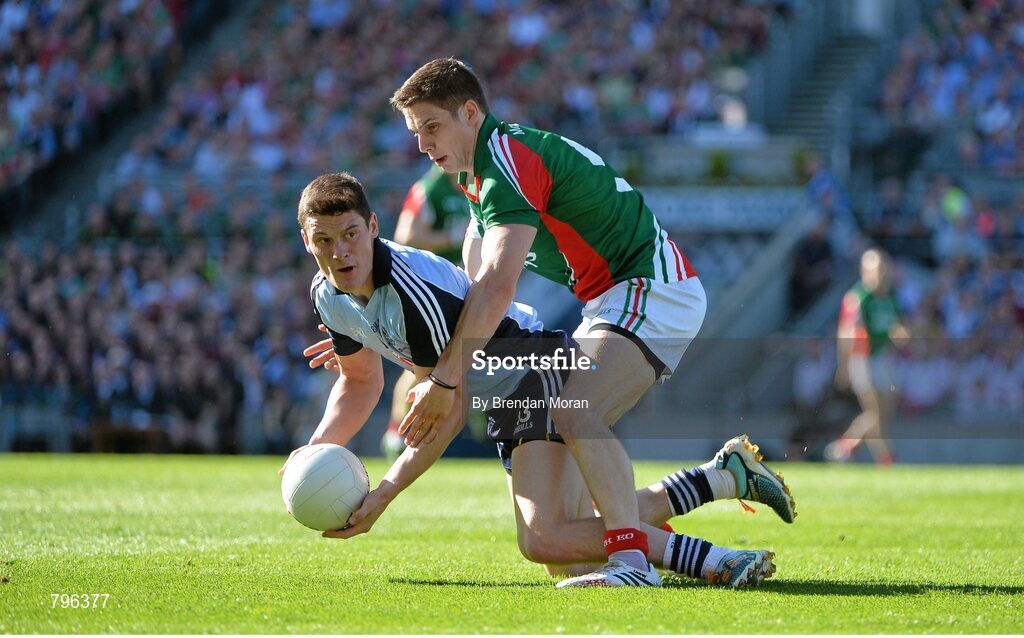 22 September 2013; Diarmuid Connolly, Dublin, in action against Lee Keegan, Mayo. GAA Football All-Ireland Senior Championship Final, Dublin v Mayo, Croke Park, Dublin. Picture credit: Brendan Moran / SPORTSFILE