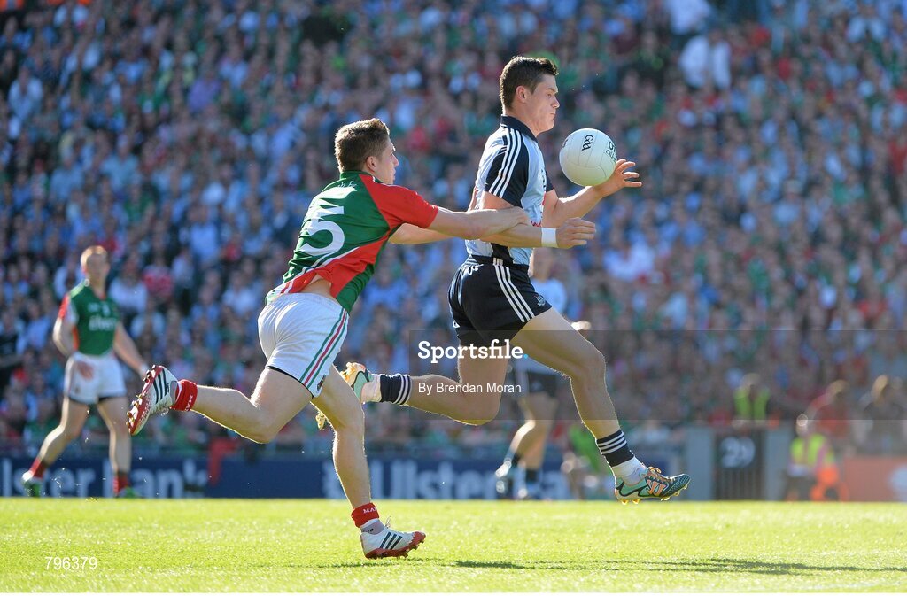 22 September 2013; Diarmuid Connolly, Dublin, in action against Lee Keegan, Mayo. GAA Football All-Ireland Senior Championship Final, Dublin v Mayo, Croke Park, Dublin. Picture credit: Brendan Moran / SPORTSFILE