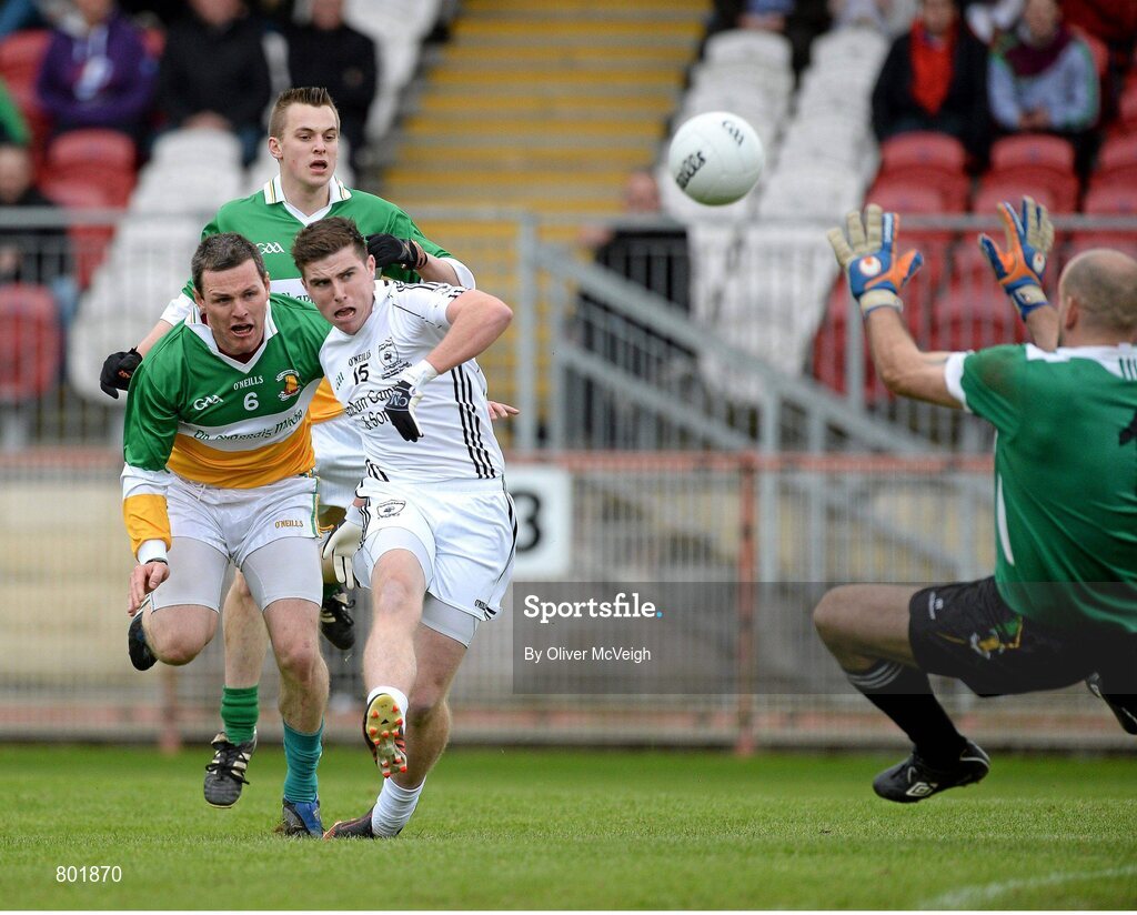 13 October 2013; Connor McAliskey, Clonoe O`Rahilly's CLG, has a shot on goal despite the efforts of Plunkett McCallan, right, Conor Gormley and Ronan Mullan, Carrickmore St Colmcille's. Tyrone County Senior Club Football Championship Final, Carrickmore St Colmcille's v Clonoe O`Rahilly's CLG, Healy Park, Omagh, Co. Tyrone. Picture credit: Oliver McVeigh / SPORTSFILE