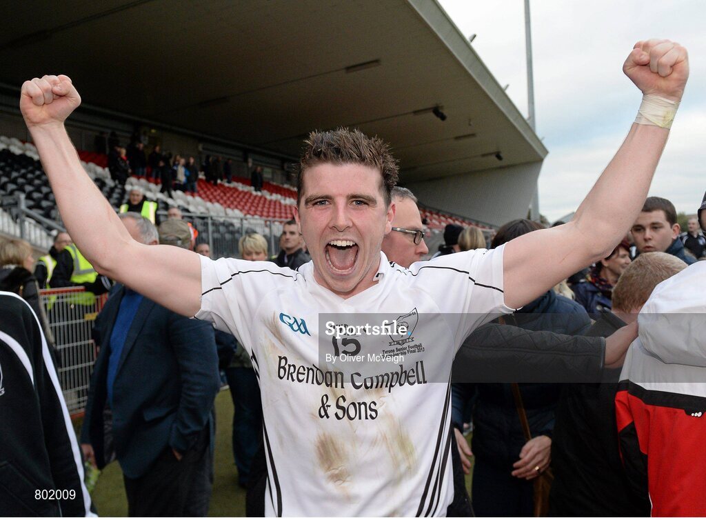 13 October 2013; Connor McAliskey, Clonoe O`Rahilly's CLG, celebrates after the game. Tyrone County Senior Club Football Championship Final, St Colmcille's v Clonoe O`Rahilly's CLG, Healy Park, Omagh, Co. Tyrone. Picture credit: Oliver McVeigh / SPORTSFILE