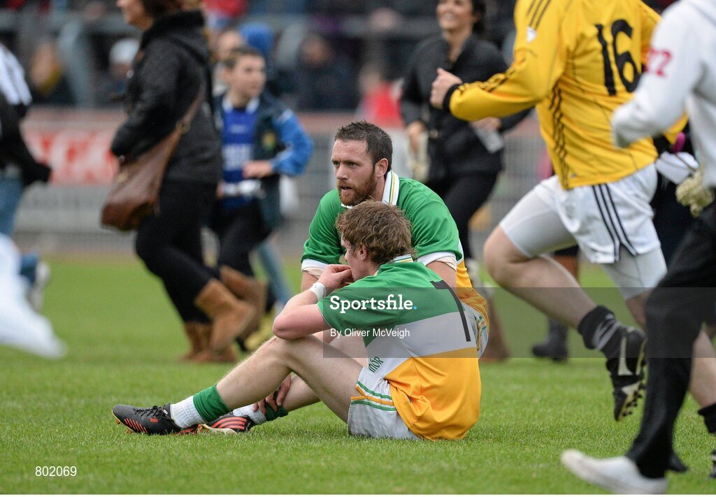 13 October 2013; A dejected Ruairi Loughran and Martin Penrose, Carrickmore St Colmcille's, at the final whistle. Tyrone County Senior Club Football Championship Final, Carrickmore St Colmcille's v Clonoe O`Rahilly's CLG, Healy Park, Omagh, Co. Tyrone. Picture credit: Oliver McVeigh / SPORTSFILE