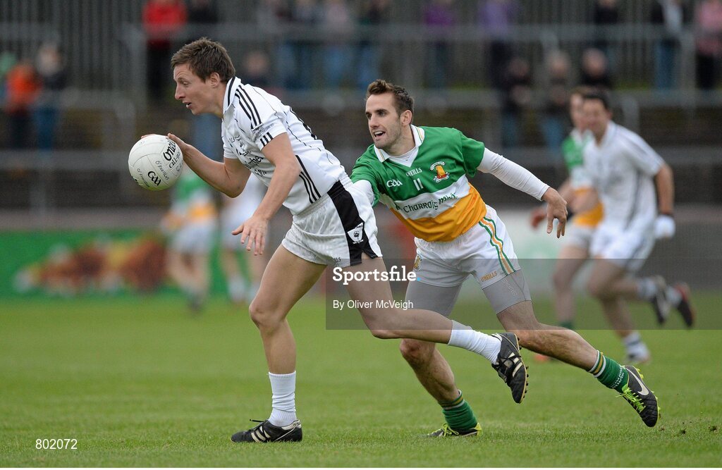 13 October 2013; Patrick Doris, Clonoe O`Rahilly's CLG, in action against Mark Donnelly, Carrickmore St Colmcille's. Tyrone County Senior Club Football Championship Final, Carrickmore St Colmcille's v Clonoe O`Rahilly's CLG, Healy Park, Omagh, Co. Tyrone. Picture credit: Oliver McVeigh / SPORTSFILE