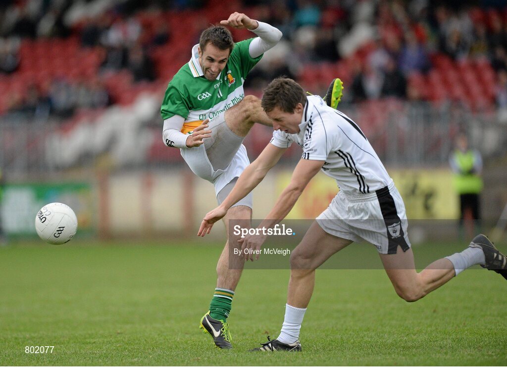 13 October 2013; Mark Donnelly, Carrickmore St Colmcille's, is blocked down by Patrick Doris, Clonoe O`Rahilly's CLG. Tyrone County Senior Club Football Championship Final, Carrickmore St Colmcille's v Clonoe O`Rahilly's CLG, Healy Park, Omagh, Co. Tyrone. Picture credit: Oliver McVeigh / SPORTSFILE