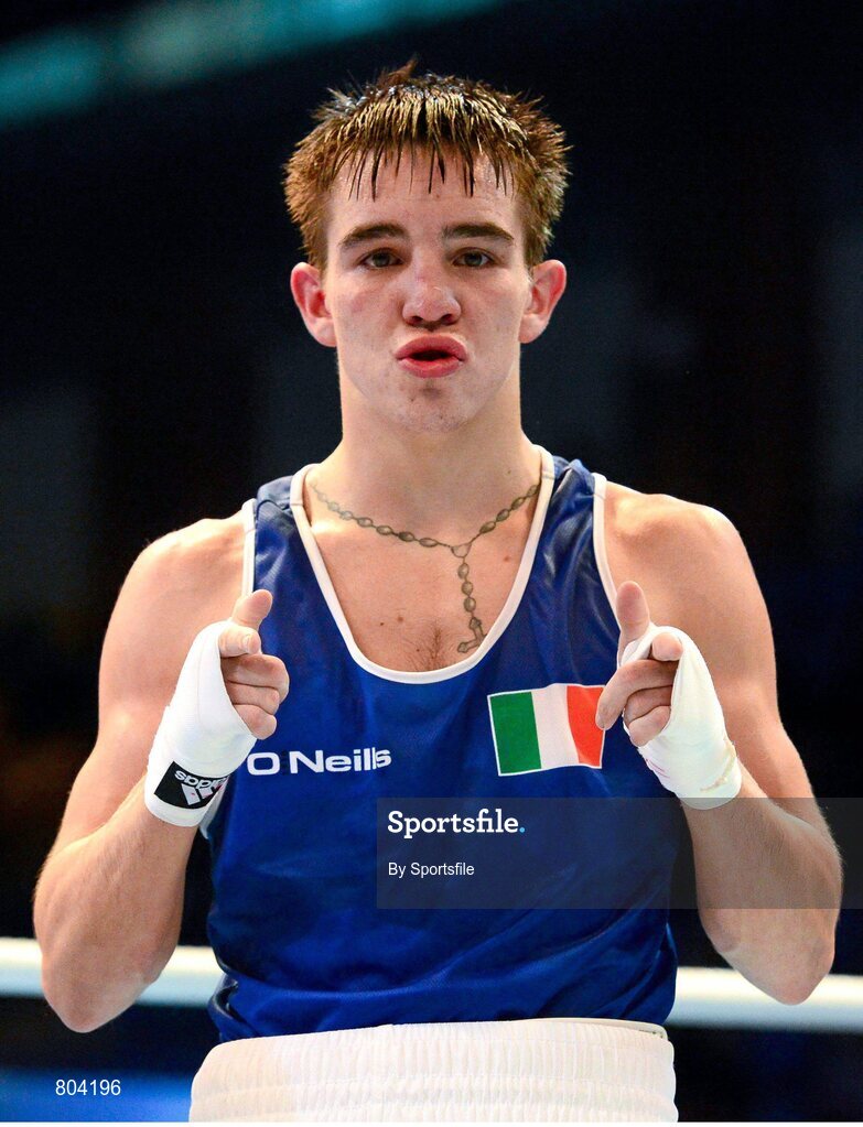 21 October 2013; Michael Conlan, St. John Bosco BC, Belfast, representing Ireland, celebrates after beating Brian Gonzalez, Mexico, in their Men's Bantamweight 56Kg Last 16 bout. AIBA World Boxing Championships Almaty 2013, Almaty, Kazakhstan. Photo by Sportsfile