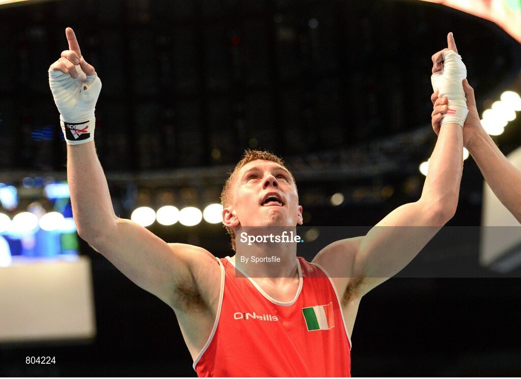 21 October 2013; Jason Quigley, Finn Valley BC, Donegal, representing Ireland, celebrates after beating Aston Brown, Scotland, in their Men's Middleweight 75Kg Last 16 bout. AIBA World Boxing Championships Almaty 2013, Almaty, Kazakhstan. Photo by Sportsfile
