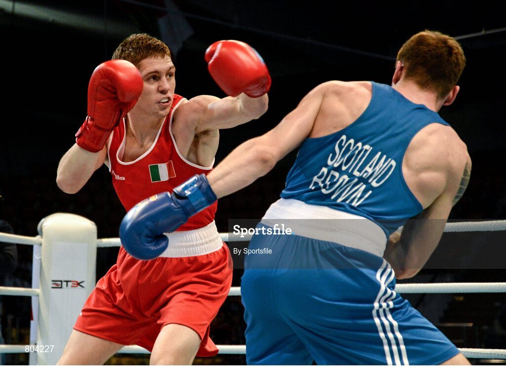 21 October 2013; Jason Quigley, left, Finn Valley BC, Donegal, representing Ireland, exchanges punches with Aston Brown, Scotland, during their Men's Middleweight 75Kg Last 16 bout. AIBA World Boxing Championships Almaty 2013, Almaty, Kazakhstan. Photo by Sportsfile