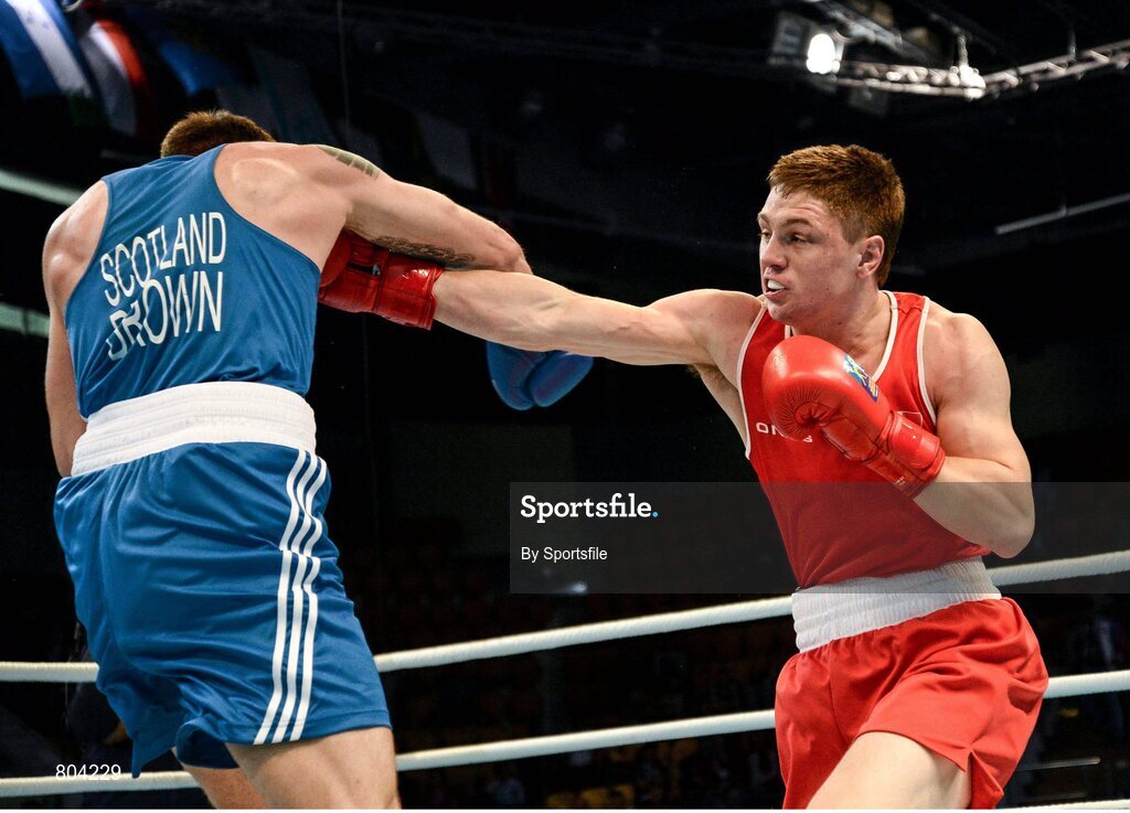 21 October 2013; Jason Quigley, right, Finn Valley BC, Donegal, representing Ireland, exchanges punches with Aston Brown, Scotland, during their Men's Middleweight 75Kg Last 16 bout. AIBA World Boxing Championships Almaty 2013, Almaty, Kazakhstan. Photo by Sportsfile