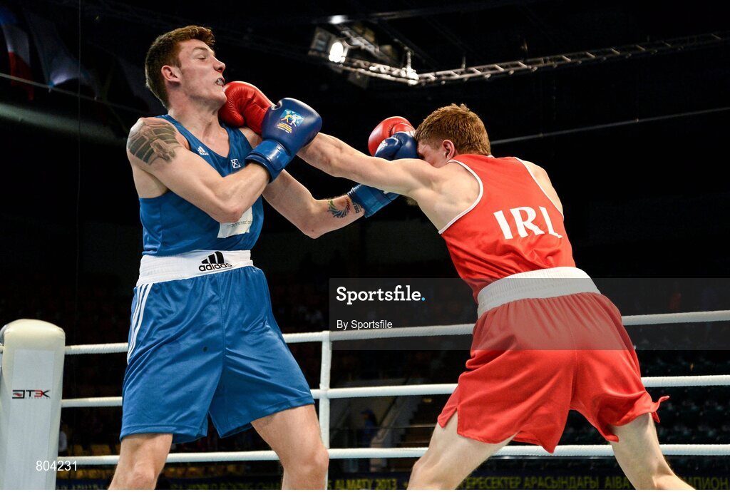 21 October 2013; Jason Quigley, right, Finn Valley BC, Donegal, representing Ireland, exchanges punches with Aston Brown, Scotland, during their Men's Middleweight 75Kg Last 16 bout. AIBA World Boxing Championships Almaty 2013, Almaty, Kazakhstan. Photo by Sportsfile