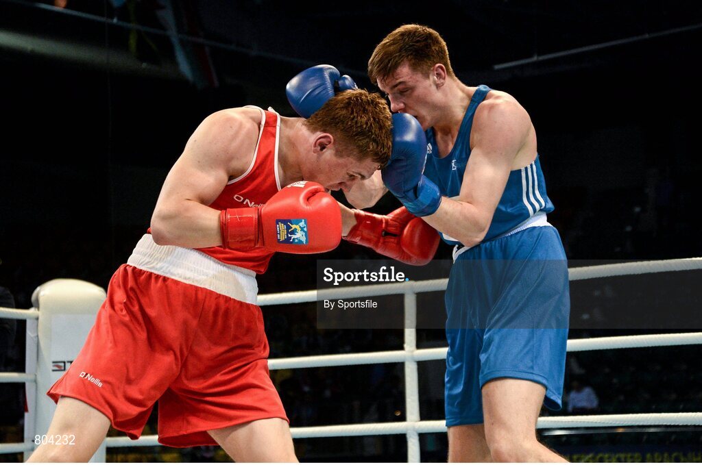 21 October 2013; Jason Quigley, left, Finn Valley BC, Donegal, representing Ireland, exchanges punches with Aston Brown, Scotland, during their Men's Middleweight 75Kg Last 16 bout. AIBA World Boxing Championships Almaty 2013, Almaty, Kazakhstan. Photo by Sportsfile